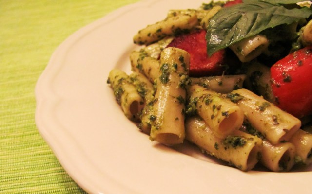 Rice Pasta with Pesto, Andouille, and Red Pepper