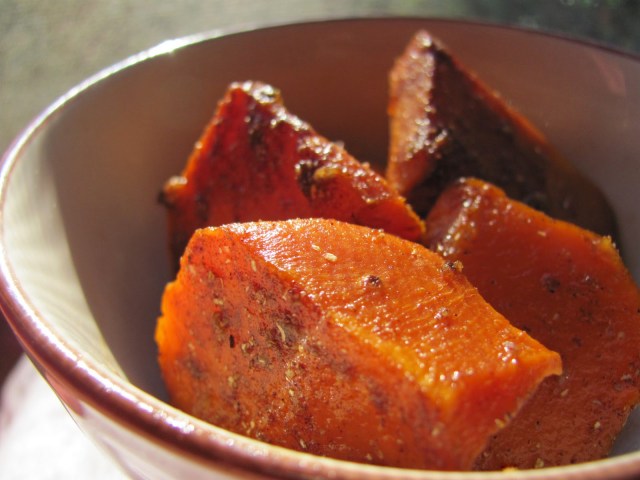When the potatoes are almost done, crush a bunch of garlic and grind some (toasted if you like) cumin and coriander. Cook the garlic, cumin, and coriander in some olive oil (or butter) and add to this some chili powder, cinnamon, and salt. This will form a sort of cooked-down paste, which you will then brush on the potatoes. Let the potatoes roast until done and enjoy!