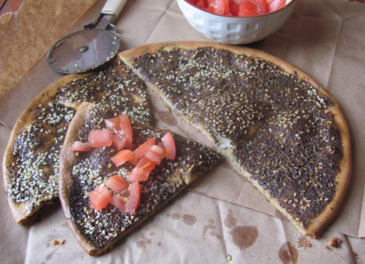 The preparation is simple. Acquire some za’tar, which you’ll find at your local Arab grocery. It may come with the sesame and sumac mixed in, or you may have to add them yourself (in which case, you should pick up some of those too). No Arab grocery in your area? You may find za’tar and sumac at your local gourmet shop, though they are likely to be wildly overpriced. You can play with the ratio of za’tar, salt, sesame seeds, and sumac until it’s to your liking, but it should be herby and tangy. This za’tar blend is then mixed with enough extra virgin olive oil to form a loose paste. Spread the paste onto the crusts, and toast them for a few minutes in an oven that’s been preheated to 450 degrees. You can eat them somewhat crunchy, but they taste better when they are softer. With these crusts, I found that using them right from the freezer yields a more pliable result. Keep an eye on your manaqeesh as they bake; they can quickly get too dry. Eat with sliced or diced tomatoes, which refreshingly counter the herbs.