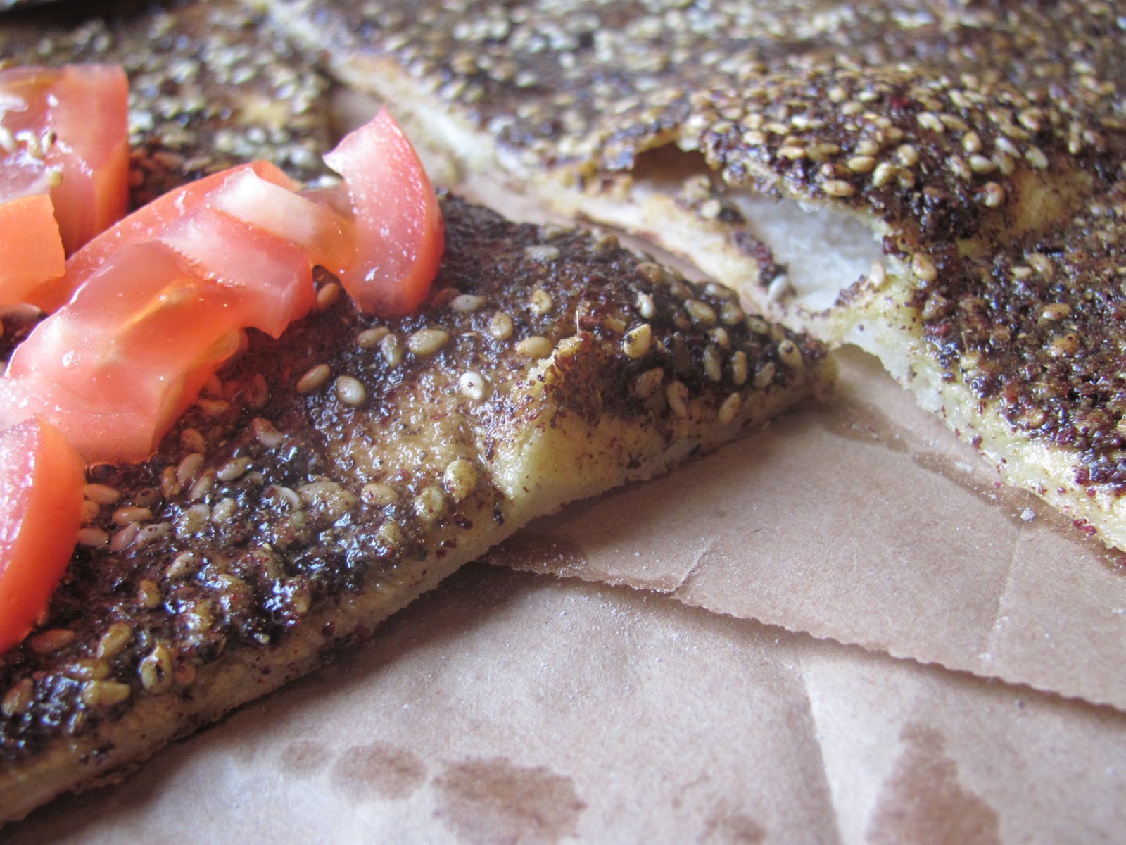 The preparation is simple. Acquire some za’tar, which you’ll find at your local Arab grocery. It may come with the sesame and sumac mixed in, or you may have to add them yourself (in which case, you should pick up some of those too). No Arab grocery in your area? You may find za’tar and sumac at your local gourmet shop, though they are likely to be wildly overpriced. You can play with the ratio of za’tar, salt, sesame seeds, and sumac until it’s to your liking, but it should be herby and tangy. This za’tar blend is then mixed with enough extra virgin olive oil to form a loose paste. Spread the paste onto the crusts, and toast them for a few minutes in an oven that’s been preheated to 450 degrees. You can eat them somewhat crunchy, but they taste better when they are softer. With these crusts, I found that using them right from the freezer yields a more pliable result. Keep an eye on your manaqeesh as they bake; they can quickly get too dry. Eat with sliced or diced tomatoes, which refreshingly counter the herbs.