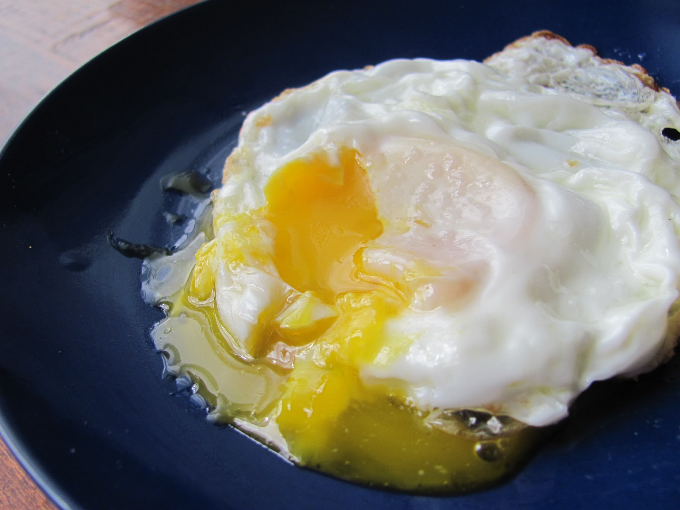 Get yourself some pastured eggs. If you can’t find them, go for organic, free-range eggs. Heat up some olive oil in a frying pan. (Do not use non-stick pans, for both health and culinary reasons!) You’ll want the olive oil to be about 1/5 of an inch high; in other words, a decent amount, but your pan shouldn’t be flooded with oil. With the oil hot, but not smoking, add your egg. Then, as soon as the bottom solidifies and the edges start to crisp, gently tilt the pan to pool the oil at one end, and spoon hot oil over the yolk. As soon as the film over the yolk becomes an opaque white (this part will take about 20 or 25 seconds), as seen here, your egg is done! Remove it pretty quickly, unless you prefer a solid yolk. Sprinkle some sea salt and freshly cracked pepper on top.