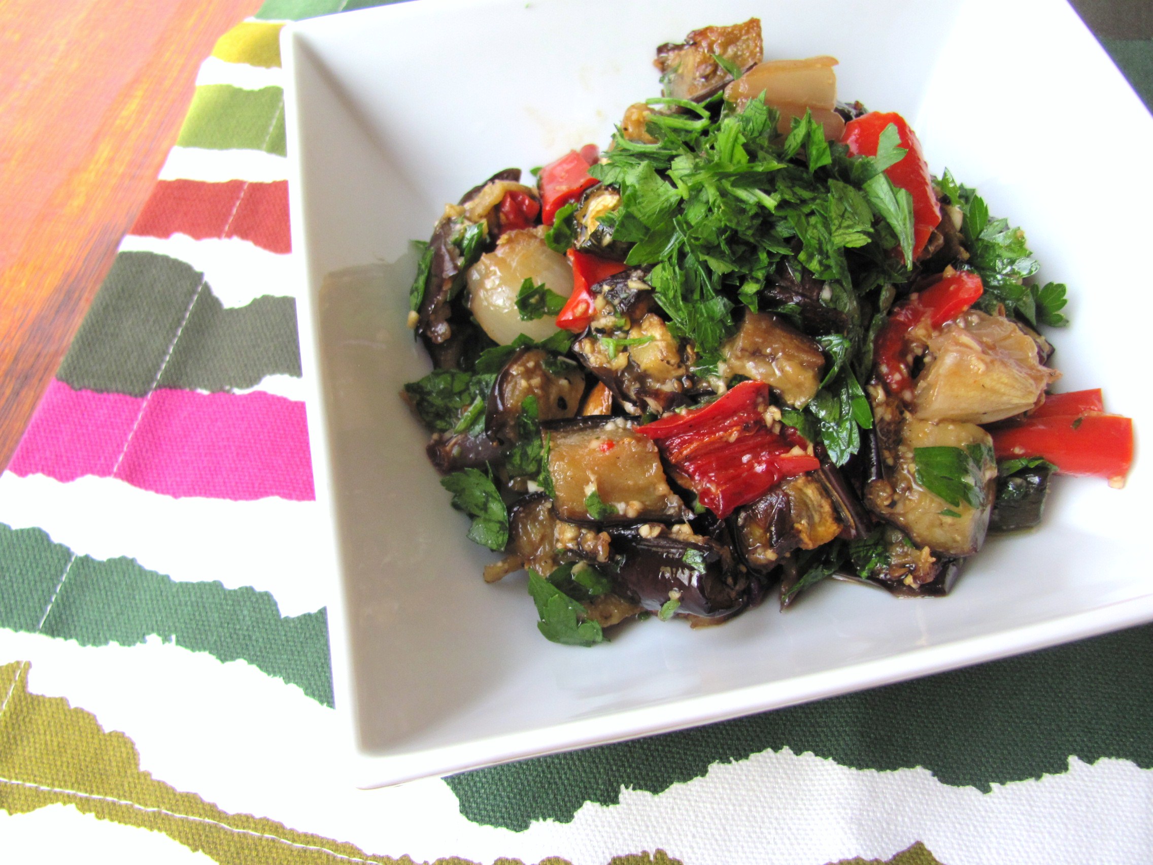 Cube some eggplants (I love eggplant skin, so I leave it on), onions, and red pepper (and maybe some zucchini or mushrooms) and place them in a pan that is lined with aluminum foil and well-oiled with olive oil. Season with salt and freshly cracked pepper, and roast until cooked at about 400 degrees.